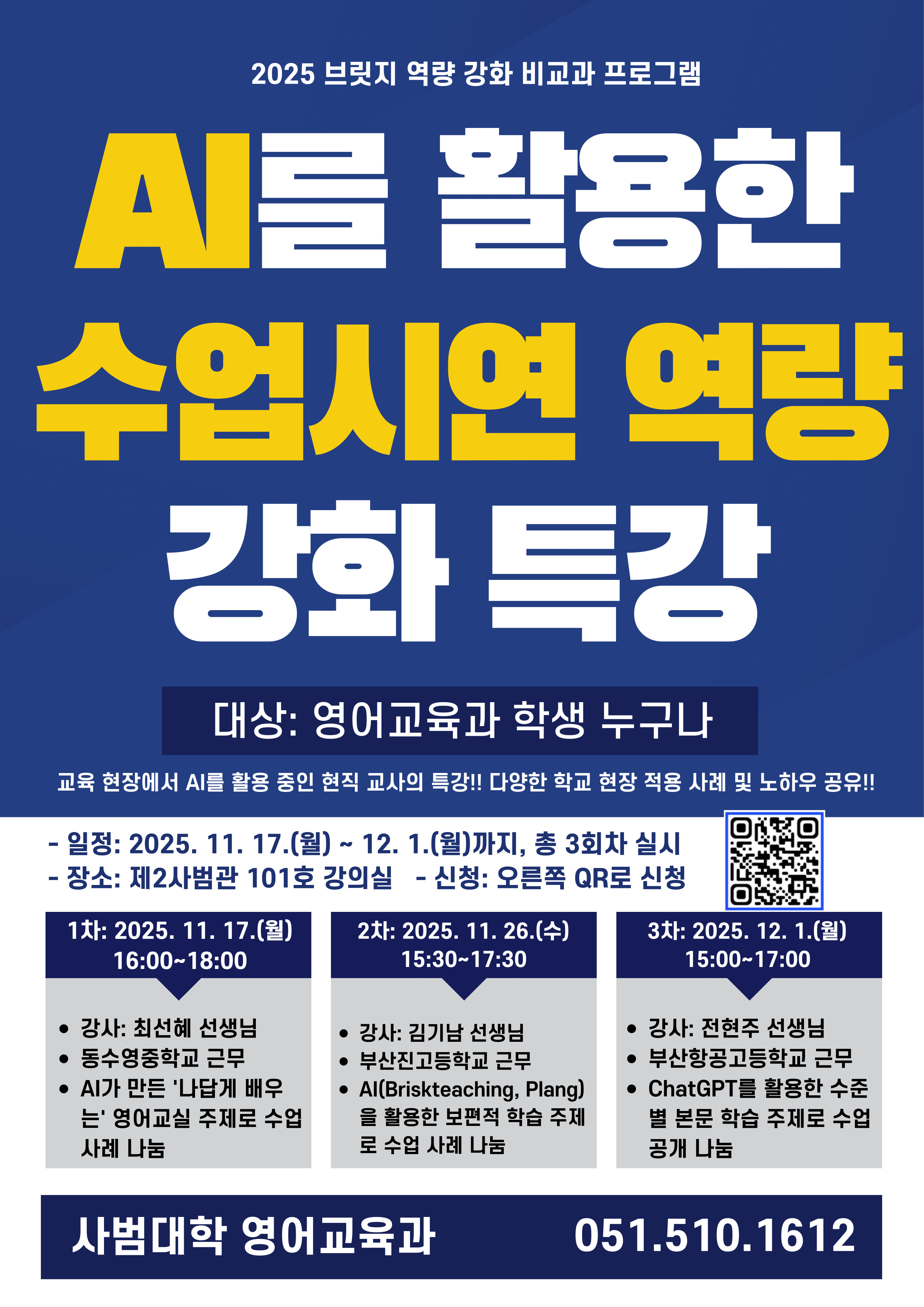 영어교육과에서 교육 현장에서 AI를 활용 중인 현직 선생님들을 모시고 AI의 다양한 학교 현장 적용 사례 및 노하우를 알려 주는 「AI를 활용한 수업시연 역량 강화」특강을 아래와 같이 개최할 예정이니 많은 참여 부탁드립니다!!