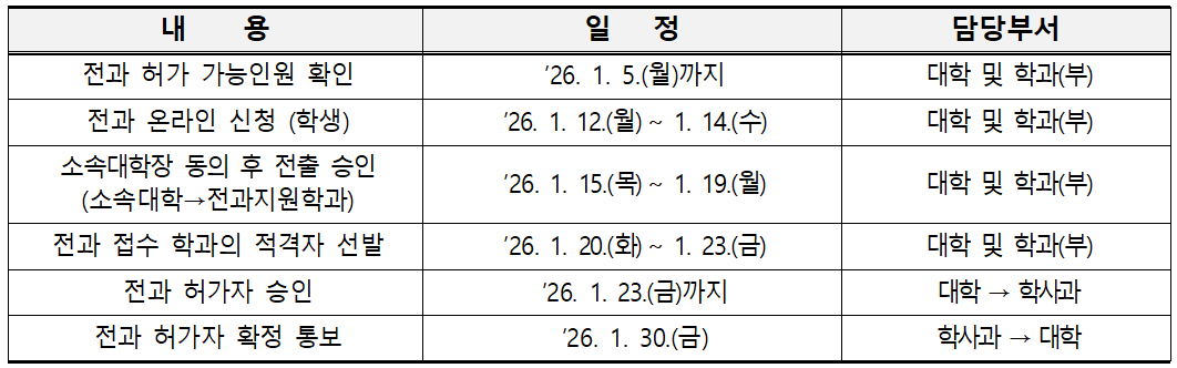 2026학년도 1학기 학부 전과 시행 계획을 다음과 같이 알려드리니, 전과를 희망하는 학생은 기간 내에 신청하시기 바랍니다.